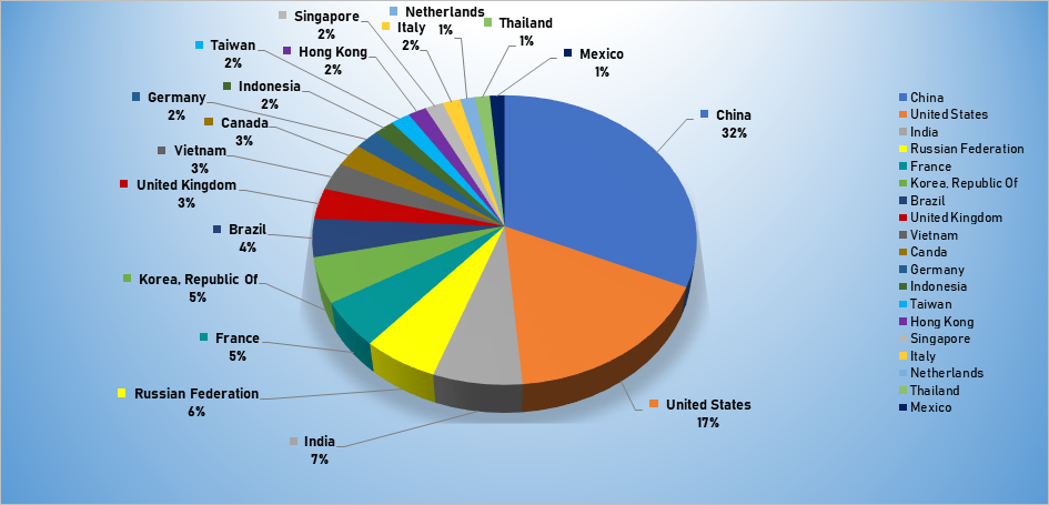 - The top attacker country was China with 2639 unique attackers (32%).