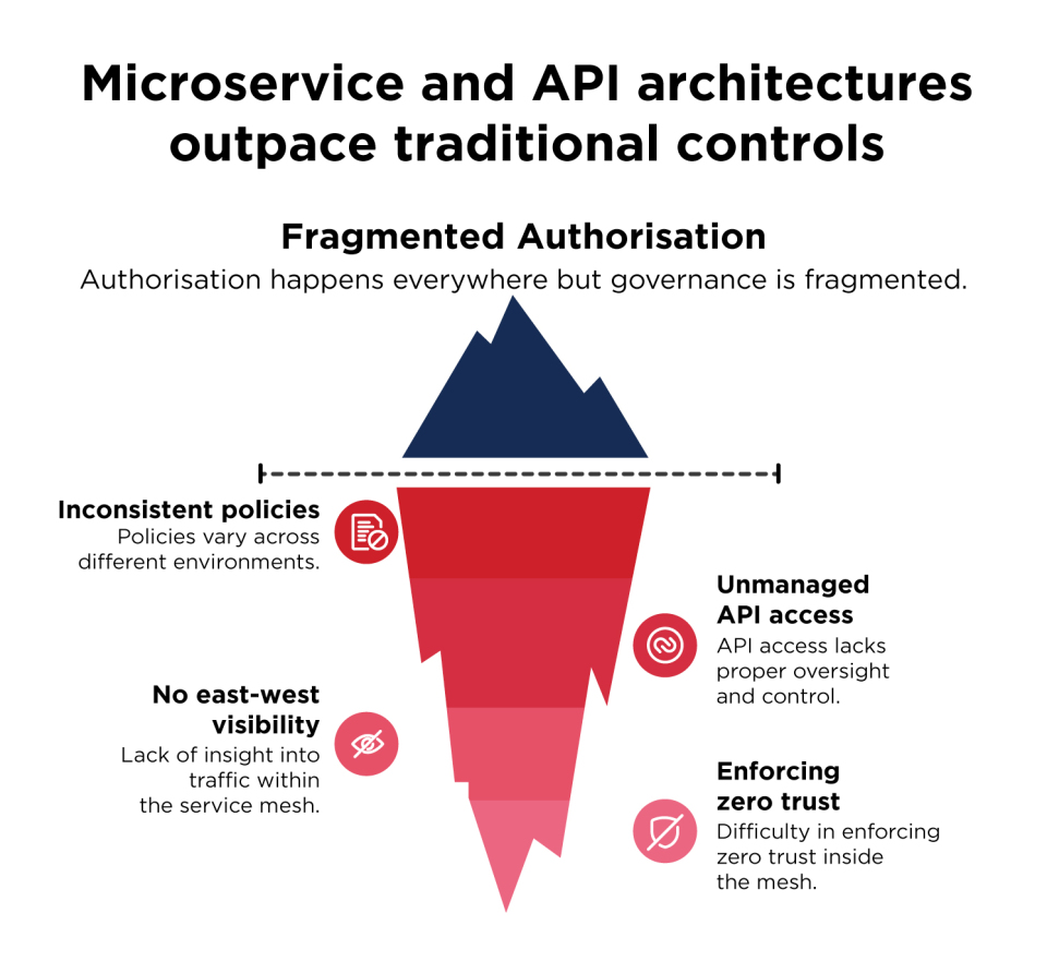 Microservice and API architectures move faster than traditional controls can keep up. Firewalls don’t understand workloads. IP rules don’t map to containers. Admission controllers drift. CI/CD pipelines push changes without governance. Infrastructure teams have lost control as developers now spin up containers, APIs, and environments without oversight, creating inconsistent configurations and security gaps. The result is messy as authorisation happens everywhere but governance is fragmented. Infra is still held responsible for uptime and security, yet they no longer have the visibility or authority to enforce standards.