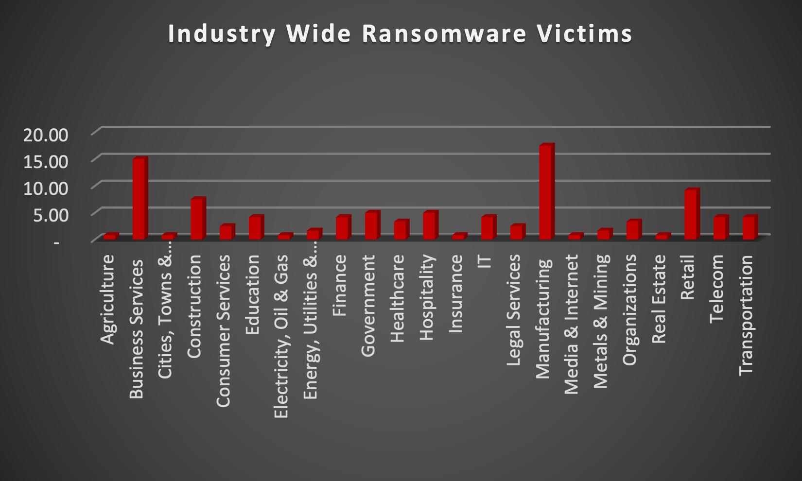 Upon further investigation, it has been identified that ransomware has left its mark on 23 different industries worldwide. Notably, Manufacturing bore the brunt of the attacks in the past week, accounting for 17% of victims. There are a few key reasons why the manufacturing sector is a prime target for ransomware groups: