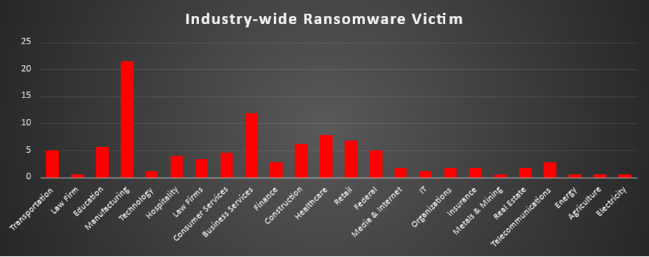Other heavily impacted industries include Retail at 6.78%, Construction at 6.21%, and Education at 5.65%, indicating ongoing security challenges in consumer markets, infrastructure development, and academic institutions. The Transportation and Federal sectors each recorded 5.08% of ransomware incidents, showing that critical infrastructure and government entities remain key targets.